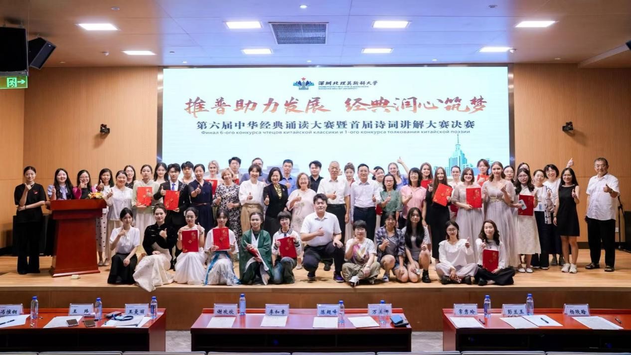 On September 21, as one of the key cultural events of the 28th National Promotion of Standard Chinese Language Week, Shenzhen MSU-BIT University (SMBU) successfully held the finals of the 6th Chinese Classics Recitation Contest and the 1st Poetry Interpretation Contest in the Library Auditorium. Jointly organized by the University Language Committee, the Chinese Language Center, and the Student Affairs Department, this year’s event was themed “Promoting Standard Chinese, Enriching the Heart Through Classics.” The competition brought together both Chinese and international students across the university to recite Chinese classics and interpret the timeless beauty of poetry. A total of 24 entries featuring nearly 30 contestants advanced to the finals, wielding the power of poetry and prose in a captivating contest of eloquence and artistry, offering the audience an immersive journey into the essence of Chinese classical culture.