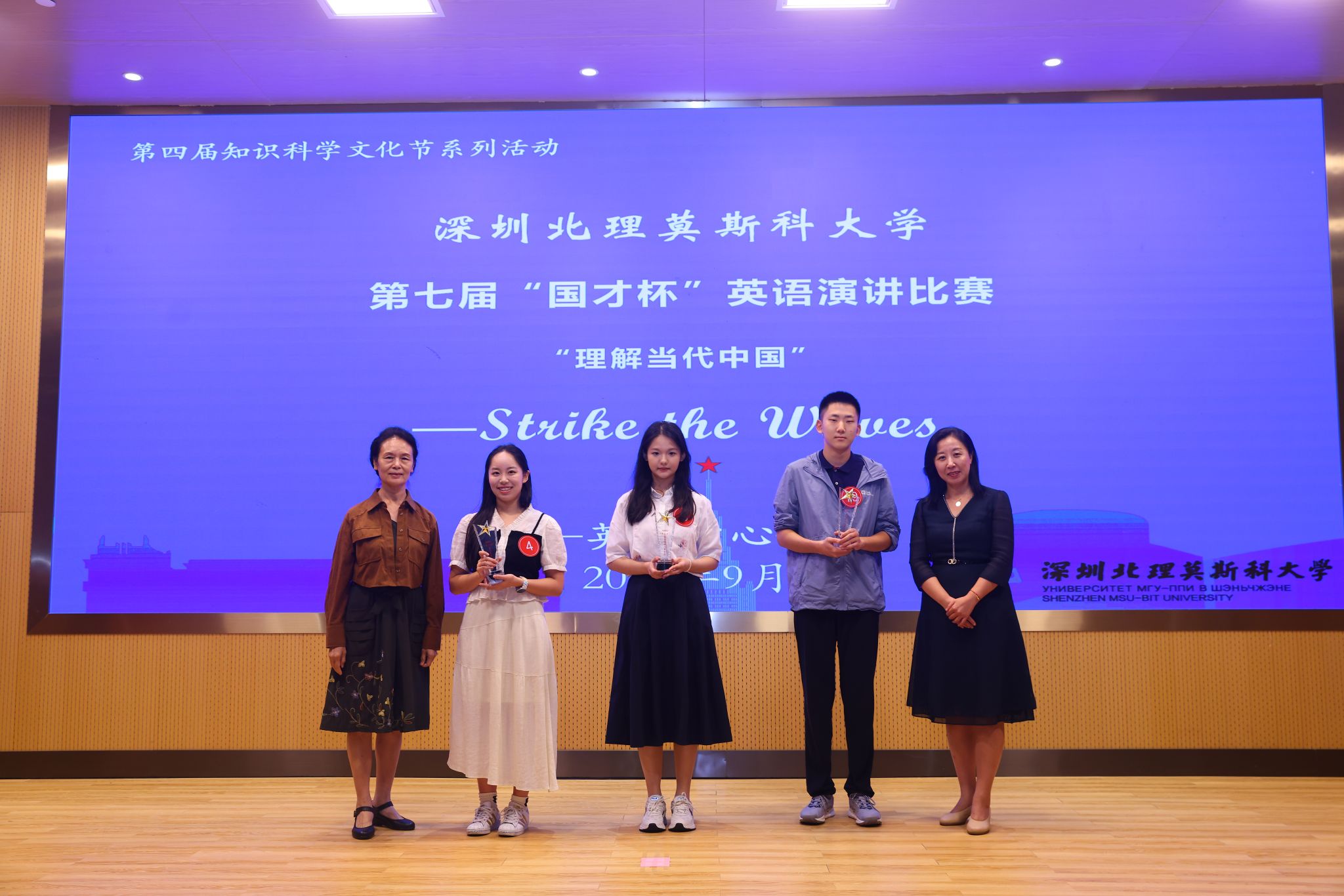 On September 27, the 7th “FLTRP·ETIC Cup” English Speaking Contest of Shenzhen MSU-BIT University (SMBU) was successfully held in the Library Auditorium. As the university-level qualifying round for the 2025 “FLTRP·ETIC Cup” National English Speaking Competition for College Students, the event attracted an enthusiastic turnout of 107 undergraduate and postgraduate participants from various faculties across the university. After a highly competitive preliminary round, 30 contestants advanced to the final stage of the university competition. As the university-level qualifying round for the 2025 “FLTRP·ETIC Cup” National English Speaking Competition for College Students, the contest attracted 107 enthusiastic participants, including both undergraduate and postgraduate students from across all faculties. Following a highly competitive preliminary round, 30 contestants advanced to the university finals. This year’s final was themed “Strike the Waves,” echoing the competition’s guiding principle of “Understanding China, Communicating with the World.” Using English as a bridge, the contestants connected personal reflections with national development, vividly demonstrating the spirit of a new generation of Chinese youth—courageous, innovative, and ready to forge ahead in an era of change. The event was filled with passion and eloquence, as participants impressed the judges and audience with their performances. In the end, three contestants won Gold Awards, five received Silver Awards, and eight earned Bronze Awards.